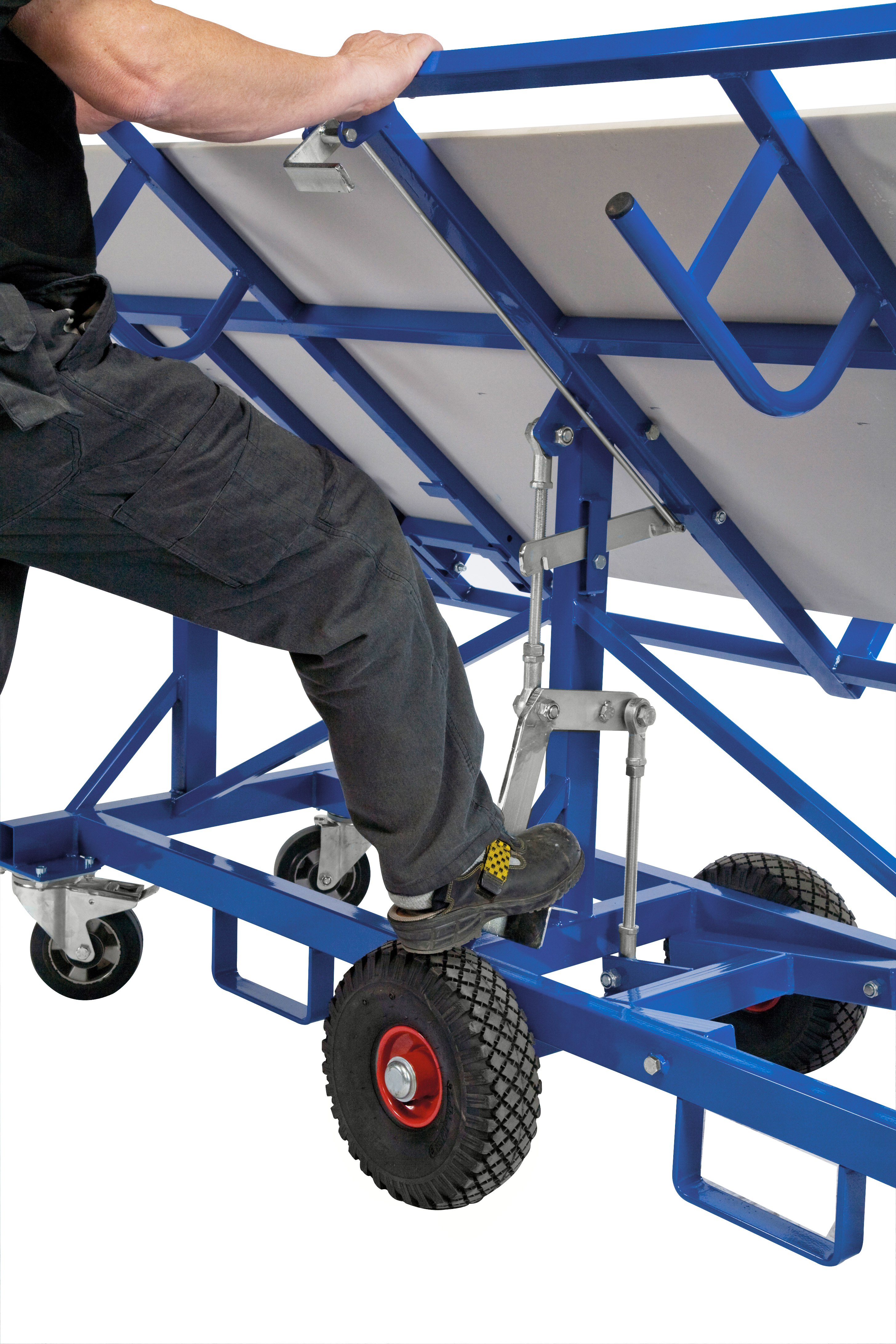 Revestimento lacado e eletrogalvanizado Altura de trabalho de 900 mm Ajustável para placas de diferentes tamanhos 2 rodízios à prova de furos de 300 x 100 mm 4 rodas giratórias (2 com travões) de 160 mm Capacidade de 500 kg