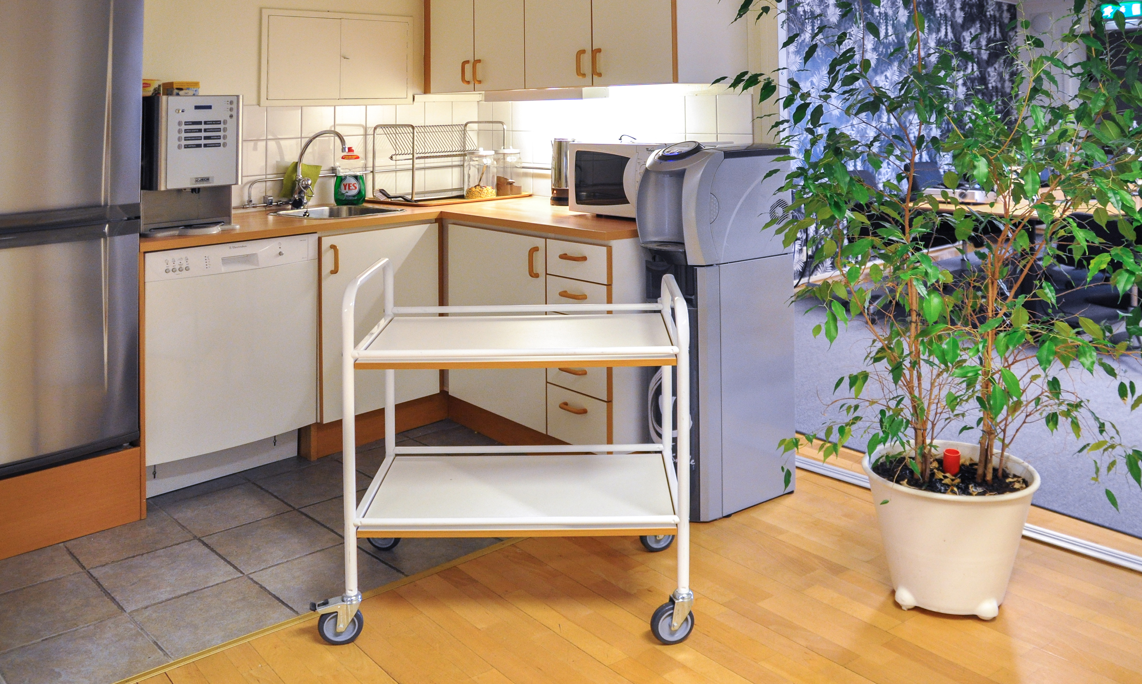 Carrinho de servir organizado com 2 prateleiras. O carrinho possui um rebordo para evitar a queda de pratos e copos durante a movimentação. Fácil de limpar devido às prateleiras em laminado. Disponível em 2 modelos.